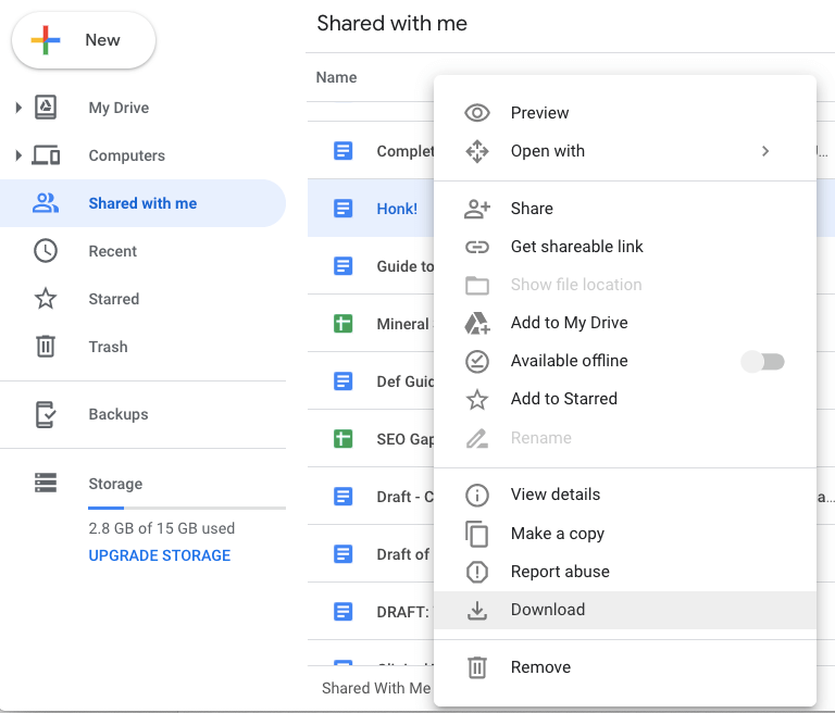 Once a file or folder has been shared with you, you can find it by clicking Shared with me in the sidebar. Here are some of the many things you can do with the files once you’ve accessed them: