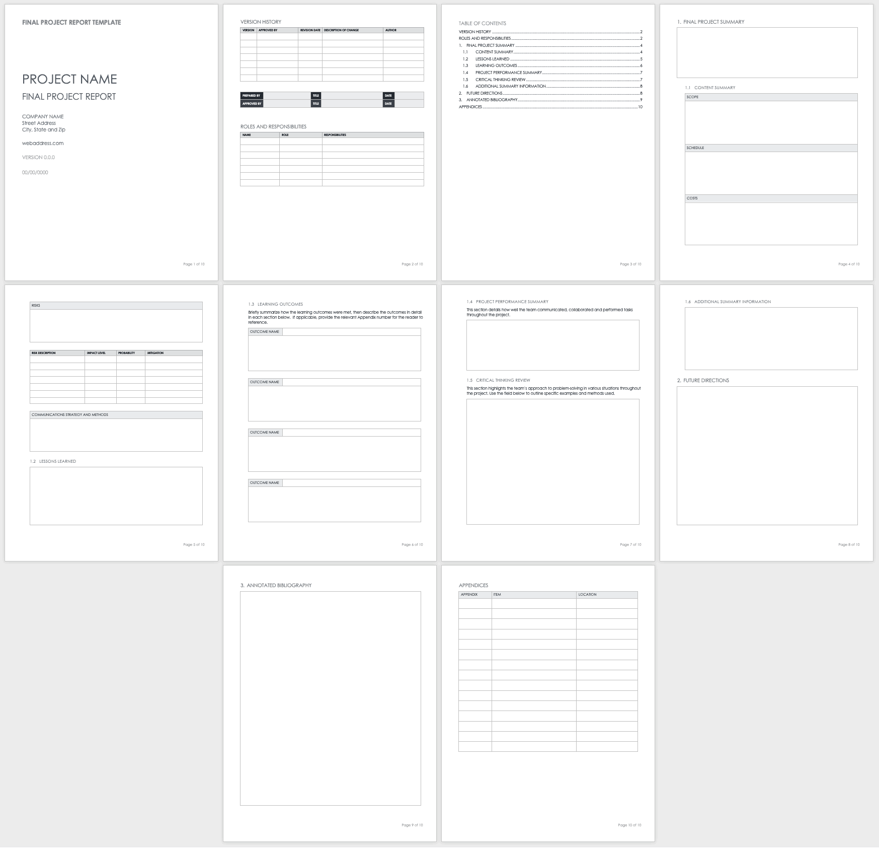 The purpose of the final project report is to briefly and clearly summarize the outcomes of a completed project. This final project report template contains a table of contents, as well as space for names and roles of team members, project summary, scope, costs, risks, communication strategies, learning outcomes, top-level project performance details, and more.
