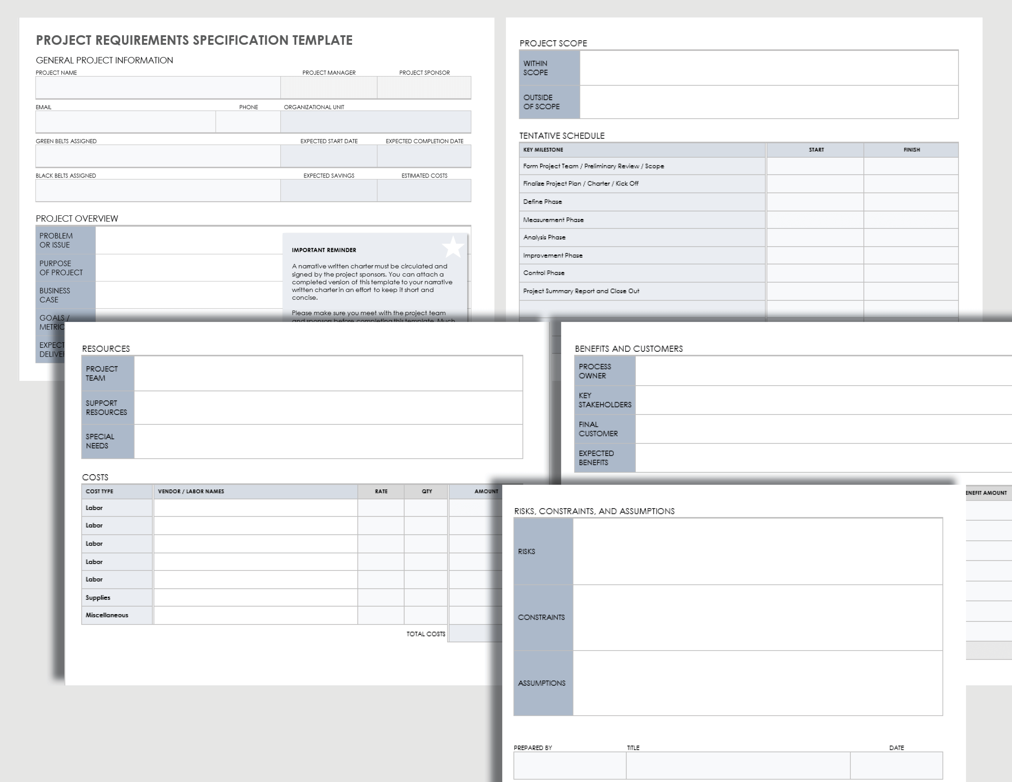 用此项目定义声明模板通知所有干系人项目进展情况。该模板包括列出项目目标、项目可交付成果、项目任务、项目范围和项目假设的部分。它还包括项目约束的详细分解,例如严格的截止日期、关键里程碑、预算约束、质量或性能约束、设备或人员约束,以及法规约束。
