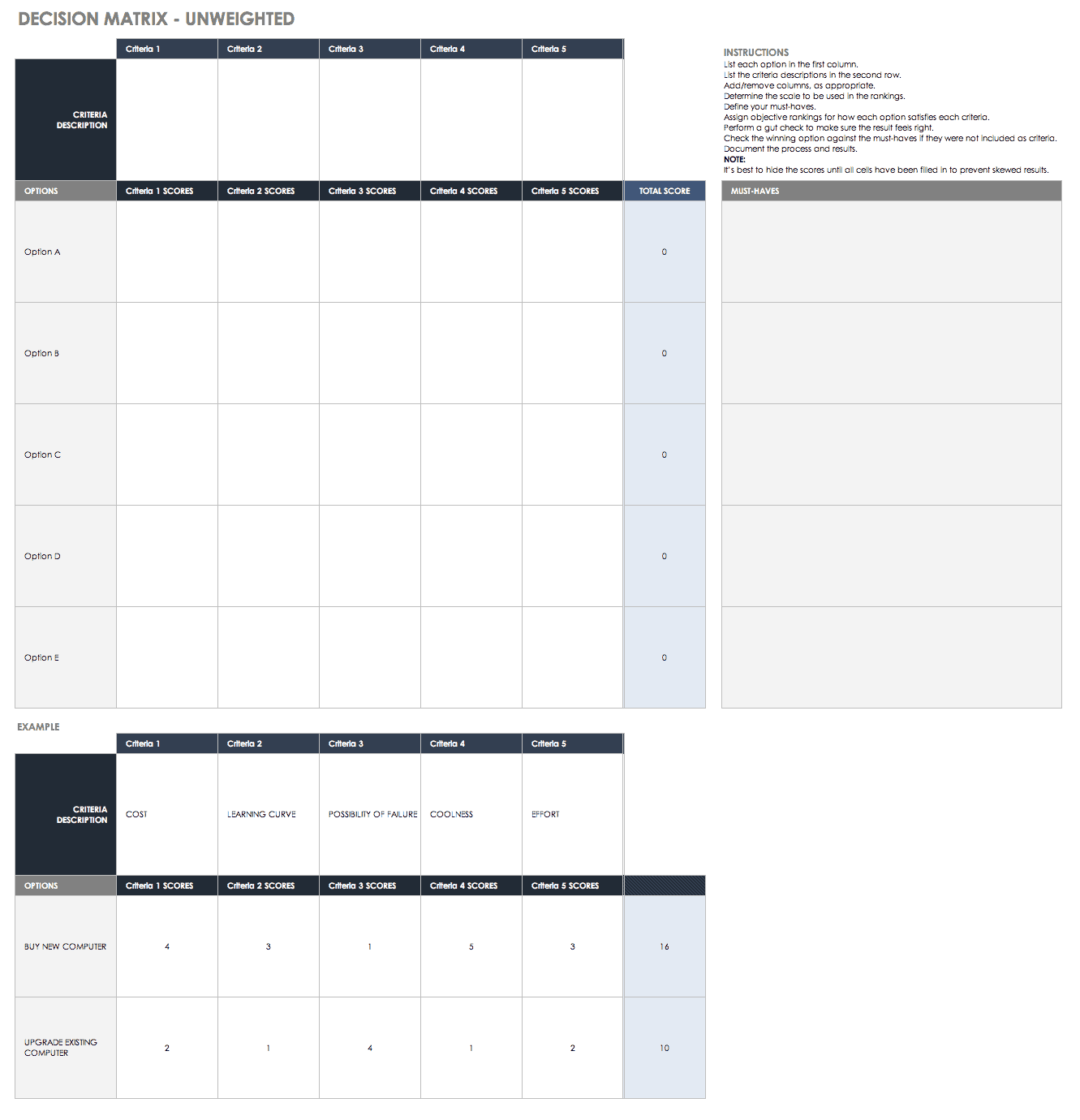 要创建一个未加权的决策矩阵,只需将选项和标准放入电子表格中(看起来像这样):
