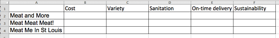 假设成本、品种、卫生方法、准时交货百分比和可持续性实践是必不可少的因素,您选择了以下当地公司进行评估: